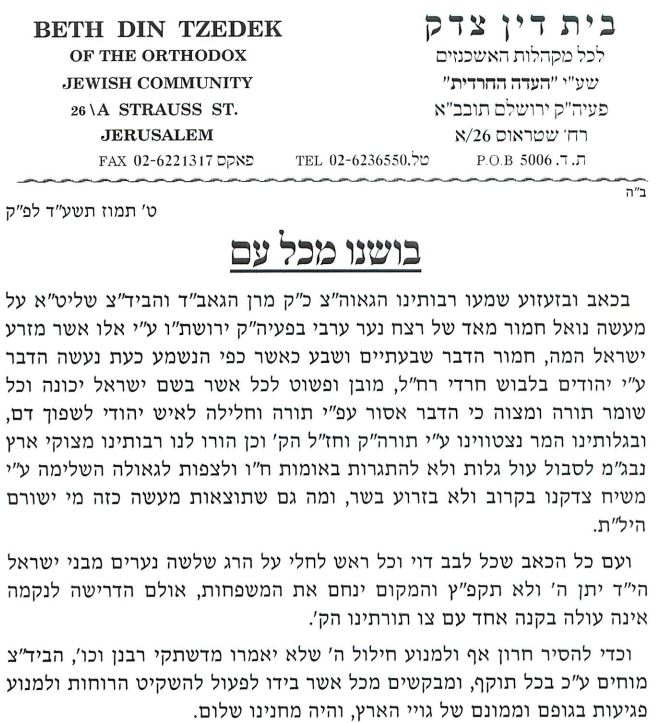 The Eidah Chareidis, the non-Zionist independent rabbinical court of Jerusalem, published a letter today condemning the brutal murder of Mohammed Abu Khder, a 16-year-old Palestinian boy from Shuafat.